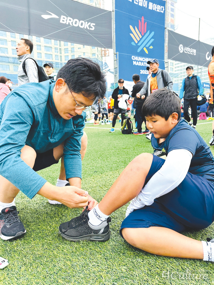 3년만의 화려한 외출! 산등선을 신비하게 물들이는 아침 해의 인사를 받으며 춘천으로 향하는 우리 모두의 마음은 설렘으로 가득했습니다. 바로 2022년 춘천국제마라톤대회(이하 ‘춘마’)가 있는 날이기 때문입니다. 이른 아침임에도 고속도로에 가득한 차들과 휴게소 곳곳에서 만나는 마라톤 복을 입은 사람들로 벌써부터 춘마의 열기가 후끈 달아올랐죠. 초등학생부터 70세가 다 된 분에 이르기까지 15명의 참여자들 중에는 이미 풀코스를 2회 이상 뛴 분부터 시작해, 처음 대회에 참여하는 새내기들도 여럿 있습니다. 몸 상태가 좋지 않아 아쉽게 뛰지 못하는 2명의 멤버도 물품 조달과 사진촬영 등으로 도움을 주었지요.