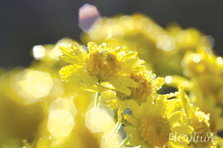 가을 어느 날 아침, 감국에 햇살이 비추고 이슬은 햇살을 받아 반짝거리는 모습을 감상할 수 있습니다. 다시 가을의 향기를 느끼려면 한참을 기다려야 할 것 같지만 벌써 올해의 마지막 달인 것을 보면 눈 깜빡할 사이에 감국 피는 가을은 다시 돌아와 있을 것이라 생각합니다.