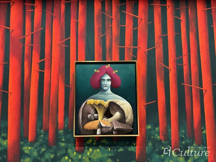 이 작품 속 인물의 몸은 거대한 버섯으로 뒤덮여 있고 머리 위에는 나비가 앉아 있습니다.
